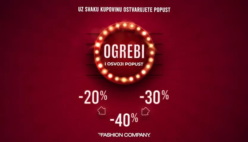 U Fashion Company prodavnicama čeka vas uzbudljivo šoping iznenađenje u okviru akcije „Ogrebi i osvoji popust“. Uz svaku kupovinu modela iz kolekcije jesen/zima 2019. osvajate popust u iznosu od 20% do 40%. Vaše je samo da odaberete omiljeni jesenji komad.