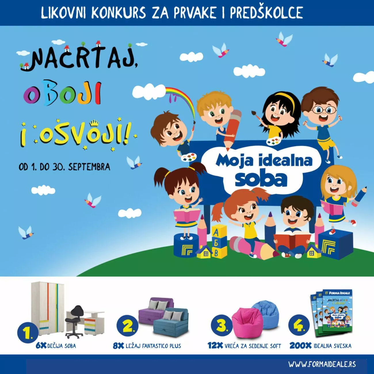 Pravi je trenutak da se kreativnost, maštovitost, originalnost i estetika dece, predškolskog i školskog uzrasta, ponovo podstaknu, a i nagrade idealnim nagradama iz Forma Ideale. U periodu od 1. do 30. septembra biće organizovan deveti po redu linkovni konkurs pod nazivom „NACRTAJ, OBOJI I OSVOJI“, sa temom „Moja idealna soba“. Zbog novonastale situacije koja je uslovila izmene u novoj školskoj godini, i uz poštovanje predloženih bezbednosnih mera, omogućeno je direktno učešće mališana na konkursu. Na sajtu www.formaideale.rs potrebno je popuniti formular traženim podacima i priložiti fotografiju crteža učesnika ili dostaviti crtež u najbiliži salon Forma Ideale.