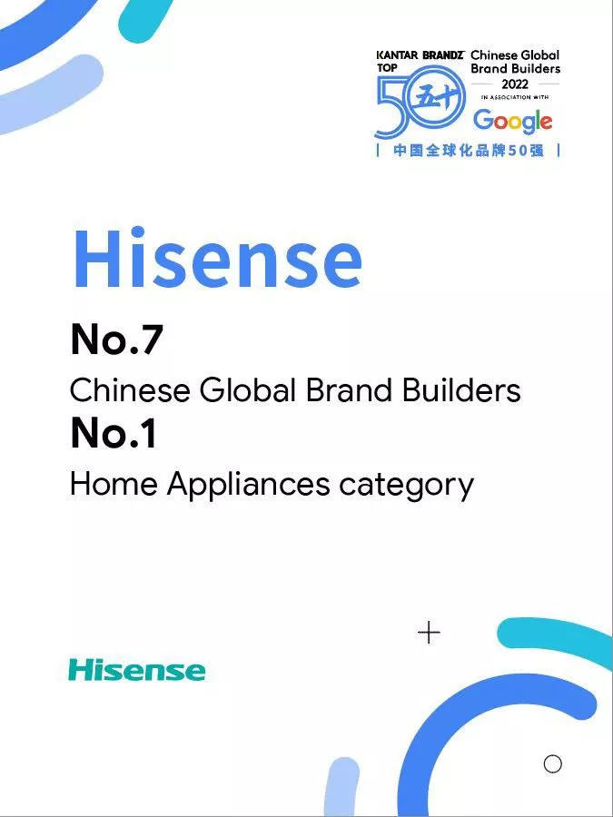 Hisense je proglašen za najboljeg proizvođača u oblasti kućnih aparata i već šestu godinu zaredom nalazi se među 10 vodećih kineskih brendova na listi koju zajednički objavljuju Google i KANTAR, svetska kompanija za istraživanja, saznanja i konsalting. Prestižna lista „KANTAR BrandZ™ Chinese Global Top 50 Brand Builders“ predstavljena je na Think with Google 2022 Google Overseas Samitu i obuhvata rezultate ankete u kojoj je učestvovalo više od milion potrošača iz 11 zemalja.