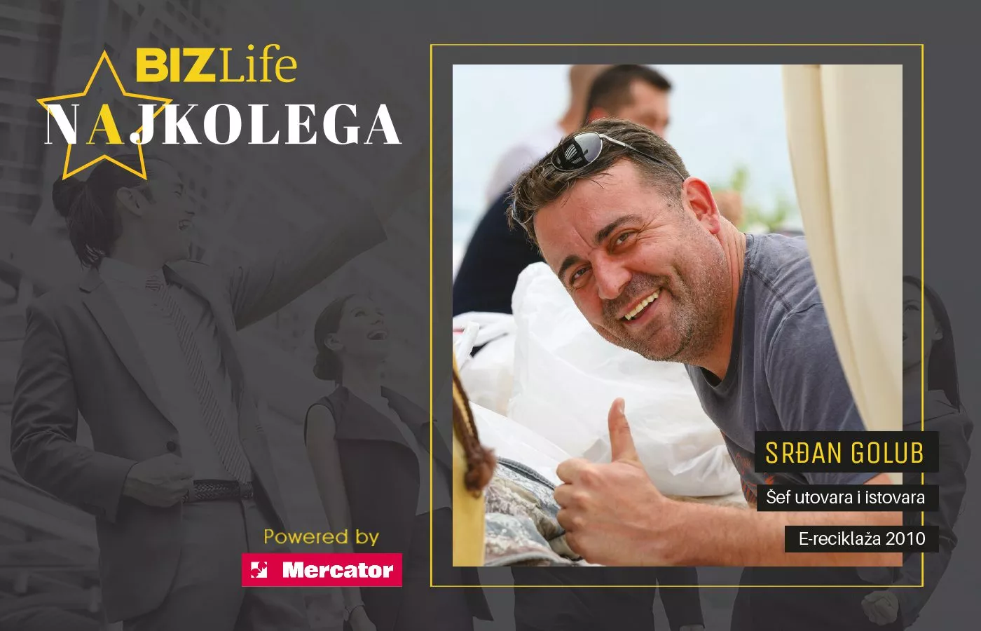 Naša kompanija broji preko 200 zaposlenih, bavimo se reciklažom električnog i elektronskog otpada, nije uvek lako i na dnevnom nivou se susrećemo sa mnogo izazova. Profesionalizam i znanje su jače strane celog našeg kolektiva, ali kada spojite humor, optimizam, srdačnost i filantropiju, dobijete osobu koju imate potrebu i želju da nominujete za NAJKOLEGU, jer on to jeste. Srđane Golube, hvala ti na svemu.”