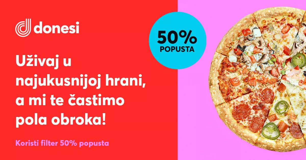 Ovakva ponuda je na svega nekoliko klikova od vas, a omiljeni obrok stiže uz pomoć Donesi, najveće platforme za online naručivanje hrane na Balkanu. Donesi već godinama unazad olakšava i ulepšava svakodnevicu gurmanima, a tokom marta je za svoje korisnike pripremio posebnu ponudu – 50% popusta na obroke iz odabranih restorana. Sve što je potrebno da uradite jeste da posetite sajt: www.donesi.com ili preuzmete Donesi aplikaciju i odabirom filtera Popust 50% pogledate spisak restorana sa ponudom obroka.