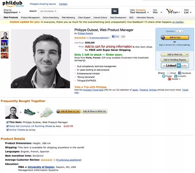 Gospodin Filip Dabost (Philippe Dubost) kreirao je sajt phildub.com, koji je u stvari njegov online CV. Kada ga otvorite, pokazuje stranicu koja podseća na Amazon, na kojoj Dabost „prodaje“ svoje veštine.