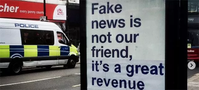 Kampanja glasi „Fake News is not our friend“ (lažne vesti nisu naš prijatelj) , a „vandali“ u Londonu na svaki plakat dodali su i „ali su sjajan izvor prihoda“.