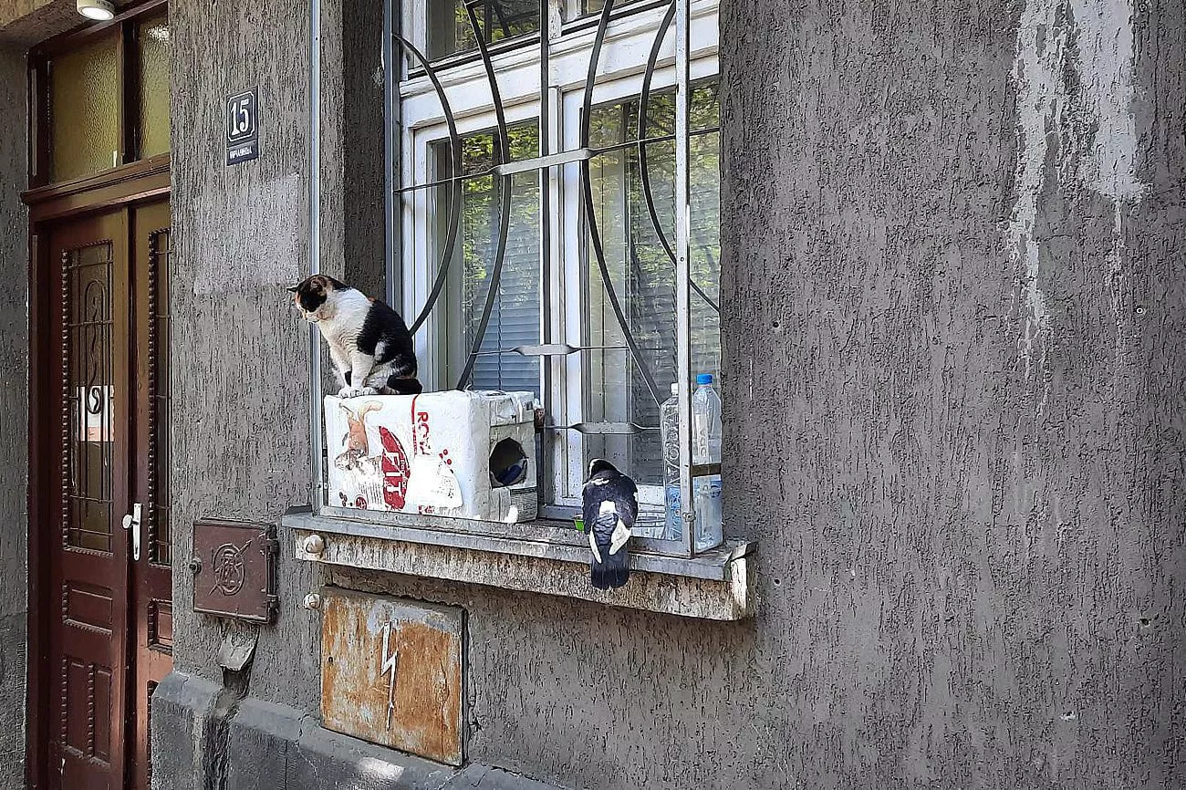 Jedna mačka, koju su „prisvojili“ stanari jedne zgrade u u Birčaninovoj ulici, na simsu prozora ima svoju kućicu i svoju posudu za hranu, ali ono što je neobično i zanimljivo, jeste da ume da ugosti gladne posetioce.