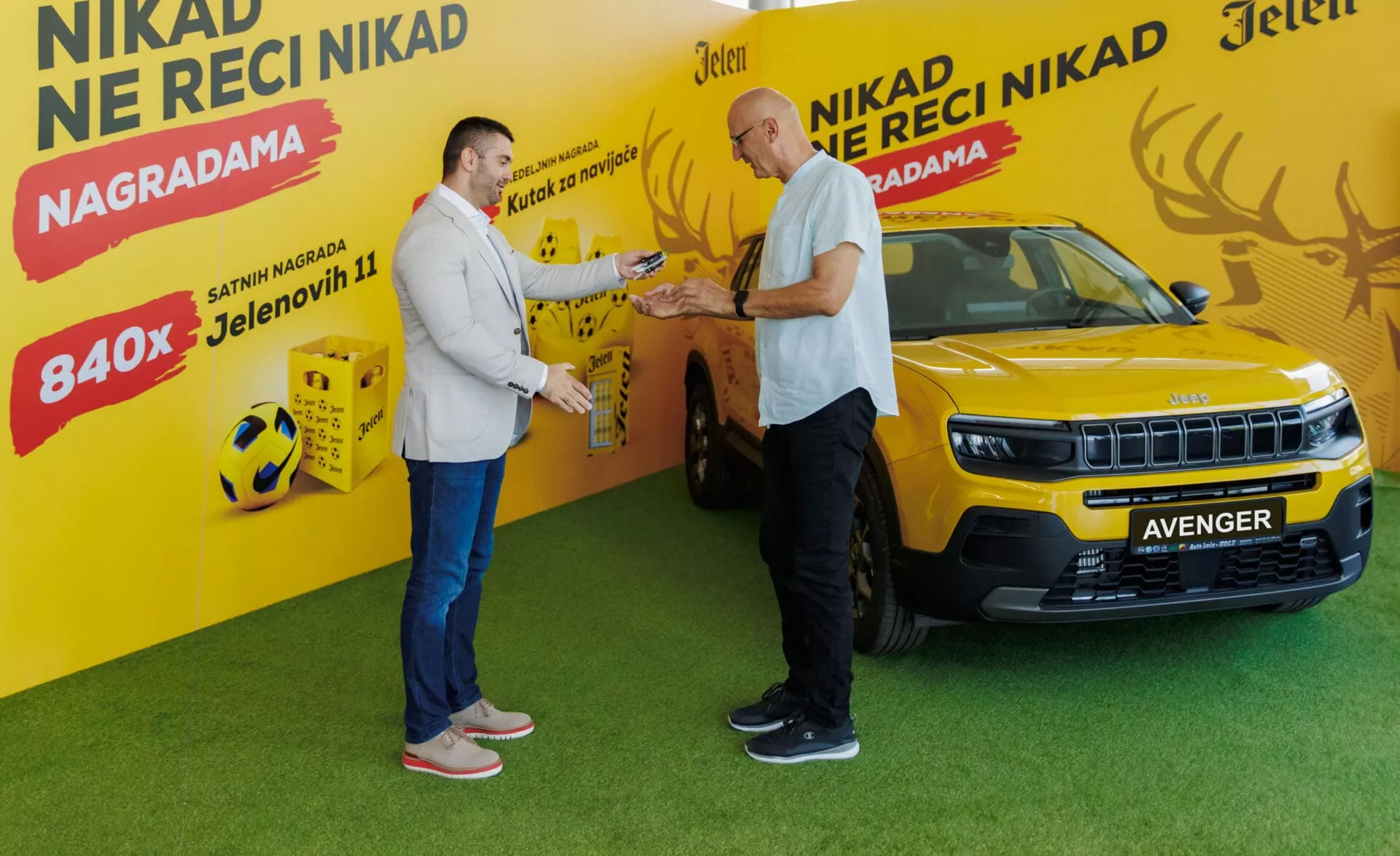 Ljubitelji Jelen piva imali su priliku da ovog leta učestvuju u nagradnoj igri pod nazivom “Nikad ne reci nikad nagradama” u okviru koje je izvučeno preko 850 satnih i nedeljnih nagrada. Najatraktivniju glavnu nagradu, automobil Jeep Avenger, osvojio je Dragi Radomirović, doktor nauka i profesor u penziji iz Novog Sada.