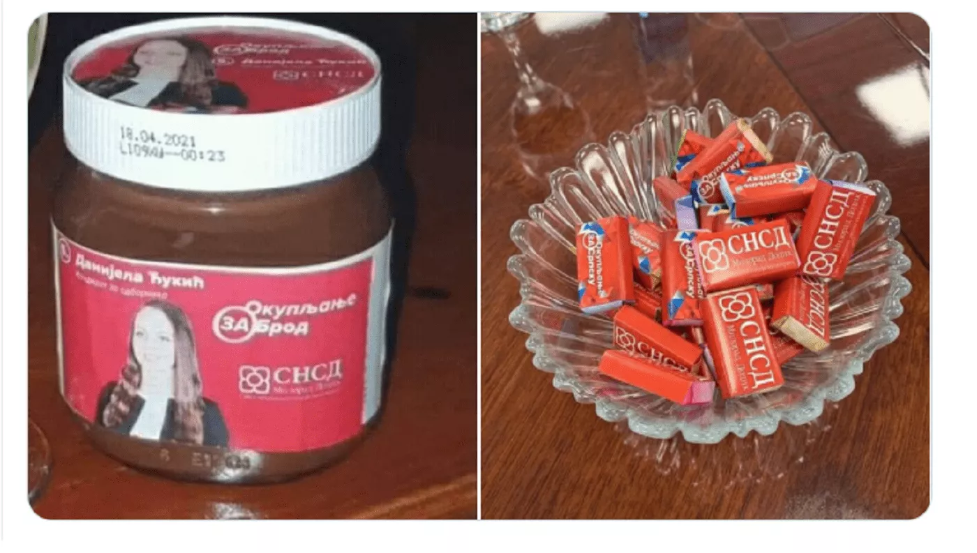 Umesto pečenja građanima se u zamenu za glas, ovaj put nude mnogo skromnije porcije, kriza je. Članovi vladajuće stranke u Republici Srpskoj odlučili su da, između ostalog, svoje reklame nalepe i na različite slatkiše, ali i paštetu.