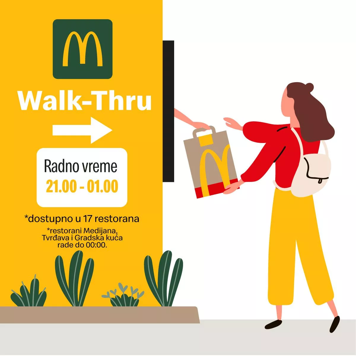 Od polovine avgusta McDonald’s u Srbiji je u određenim restoranima širom zemlje, spisak svih restorana možete pogledati ovde, uveo novu uslugu za svoje goste – Walk Thru koja podrazumeva da hranu možete poručiti na posebnom prozoru namenjenom ovoj usluzi, bez ulaska u sam restroran.