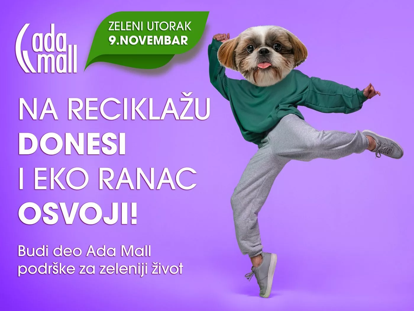 Šoping praznik koji već više od pola godine osvaja sve veći broj poklonika, ZELENI UTORAK u ADA MALL-u, 9. novembra u fokus stavlja modnu reciklažu. Ukoliko planirate zimsko raspremanje i osvežavanje garderobera, ovo je sjajna prilika da učinite dobro delo. Sve što bi trebalo da uradite jeste da donesete stari komad odeće na pultu za reciklažu u prizemlju kod info deska i dobijate specijalni eko ranac na poklon. Akcija traje dok traju zalihe.