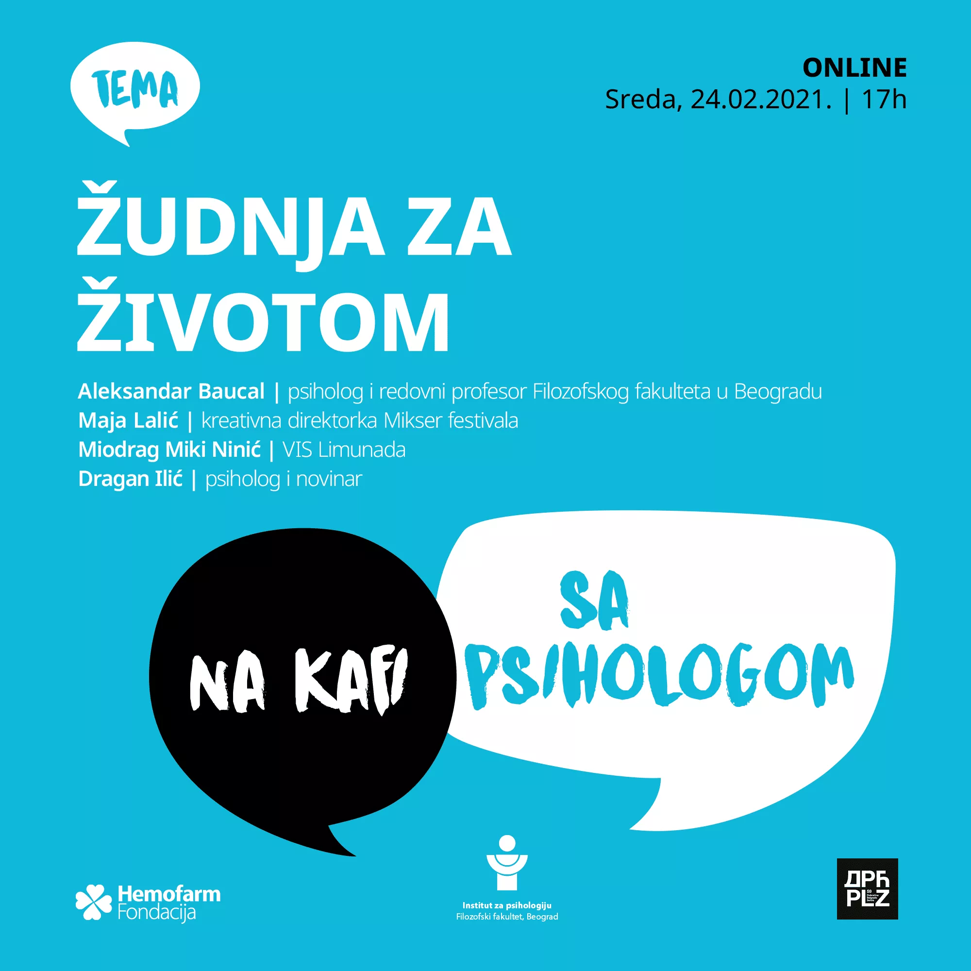 O tome koliko u stvari žudimo za životom i kako je pandemija uticala na nas, u okviru najnovije tribine Hemofarm fondacije „Na kafi sa psihologom” razgovarali su prof. dr Aleksandar Baucal, psiholog i redovni profesor Filozofskog fakulteta u Beogradu, Maja Lalić, kreativna direktorka Mikser festival i Miodrag Miki Ninić, frontmen benda VIS Limunada. Moderator tribine bio je Dragan Ilić, psiholog i novinar.