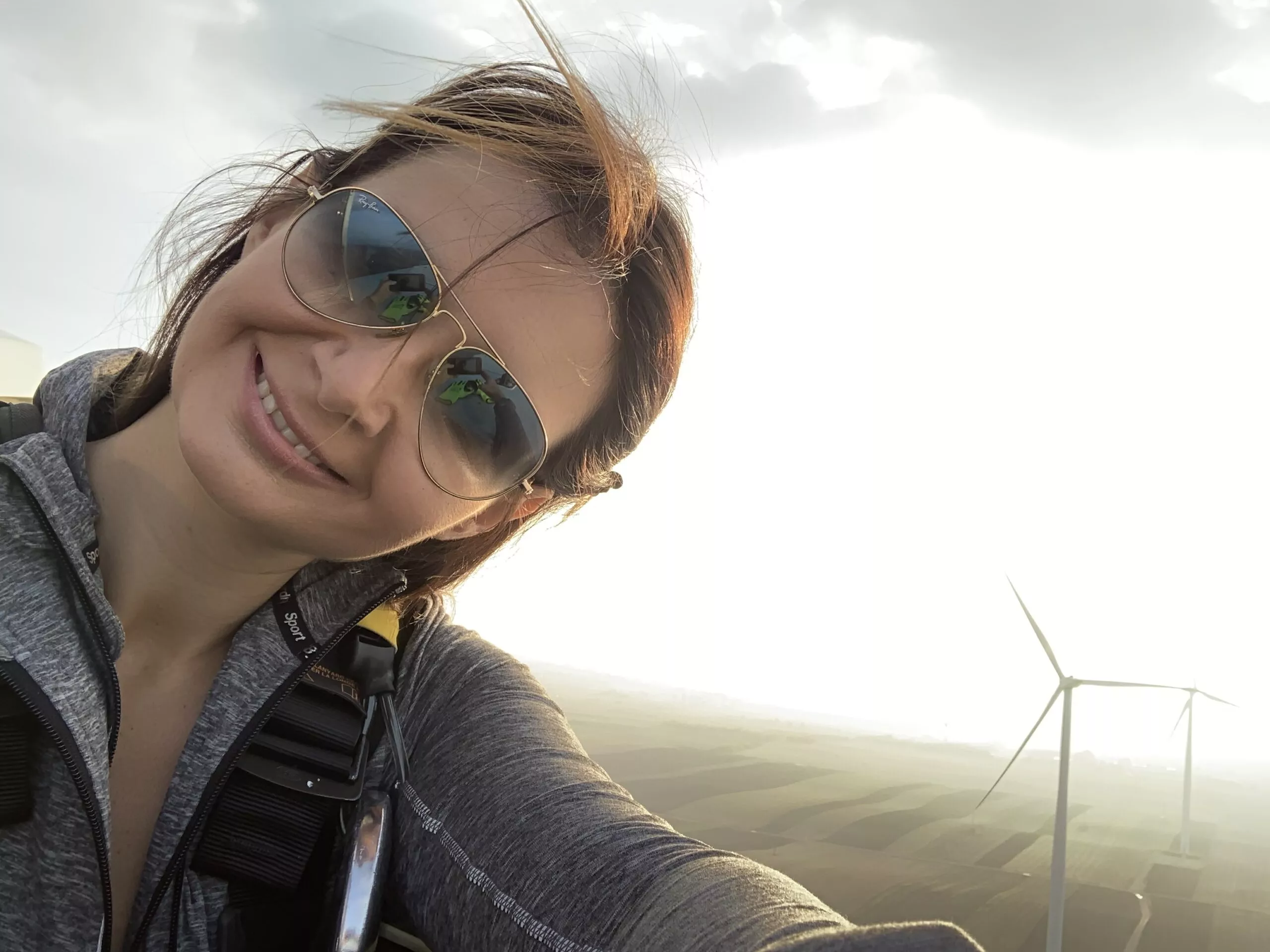 Nisam više jedina, posle mene su se još neke koleginice osmelile. Visina je oko 102 metra. Osim kolega kojima je u opisu posla održavanje vetrogeneratora, druge kolege ne pokazuju interesovanje da se popnu na vrh turbine. Prvi put sam se popela na turbinu u Belgiji, 2015. godine. U Srbiji tada nije bilo vetroparkova i za nas je svaka vetroturbina bila atrakcija. Slikali smo se pored svake, sumnjajući da će se ikad izgraditi kod nas. Prošle godine sam se konačno popela na jednu domaću. Osim fizičke kondicije – jer se delom ide merdevinama, a delom liftom, pod vrlo teškom zaštitnom opremom – neophodna je hrabrost. Ko ima fobiju od zatvorenog prostora, a zatim od visine, to ne treba ni da zamišlja. Meni je osećaj fantastičan. Ceo Banat na dlanu, vetar jači nego na zemlji, fantastični predeli ukrašeni vetroturbinama.