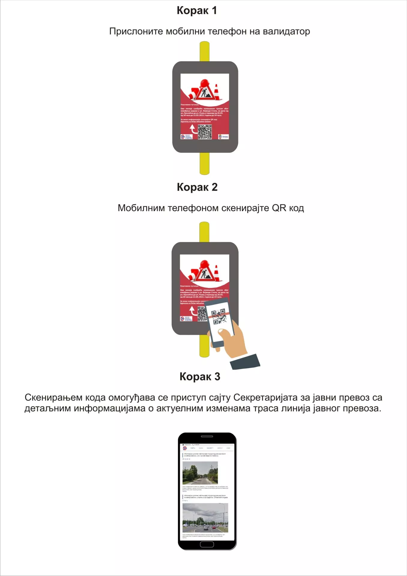Kako je navedeno na sajtu beograd.rs, za brz i jednostavan pristup informacijama o svim aktuelnim izmenama trasa linija JLPP-a na validatorima će biti dostupan i QR kod čijim skeniranje putem mobilnog telefona korisnici pristupaju sajtu Sekretarijata za javni prevoz – a dato je i uputstvo za upotrebu i skeniranje QR koda.