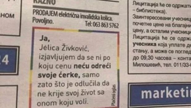 “Ja, Jelica Živković, izjavljujem da se ni po koju cenu neću odreći svoje ćerke, samo zato što je odlučila da ne krije svoj život sa onom koju voli”, doslovce stoji u oglasu.