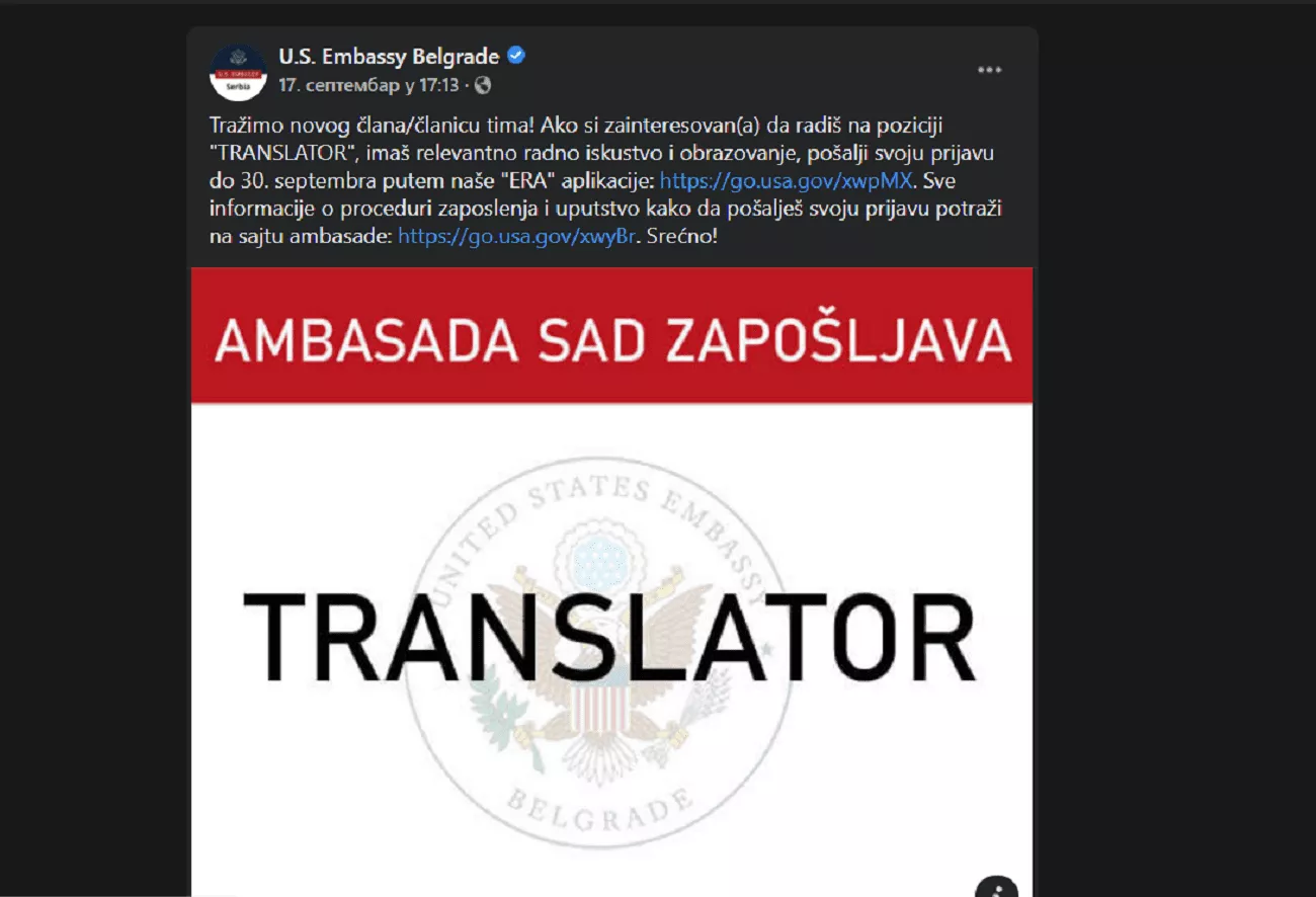 „Tražimo novog člana/članicu tima! Ako si zainteresovan(a) da radiš na poziciji „TRANSLATOR“, imaš relevantno radno iskustvo i obrazovanje, pošalji svoju prijavu do 30. septembra putem naše „ERA“ aplikacije. Sve informacije o proceduri zaposlenja i uputstvo kako da pošalješ svoju prijavu potraži na sajtu ambasade. Srećno!“, napisali su oni.