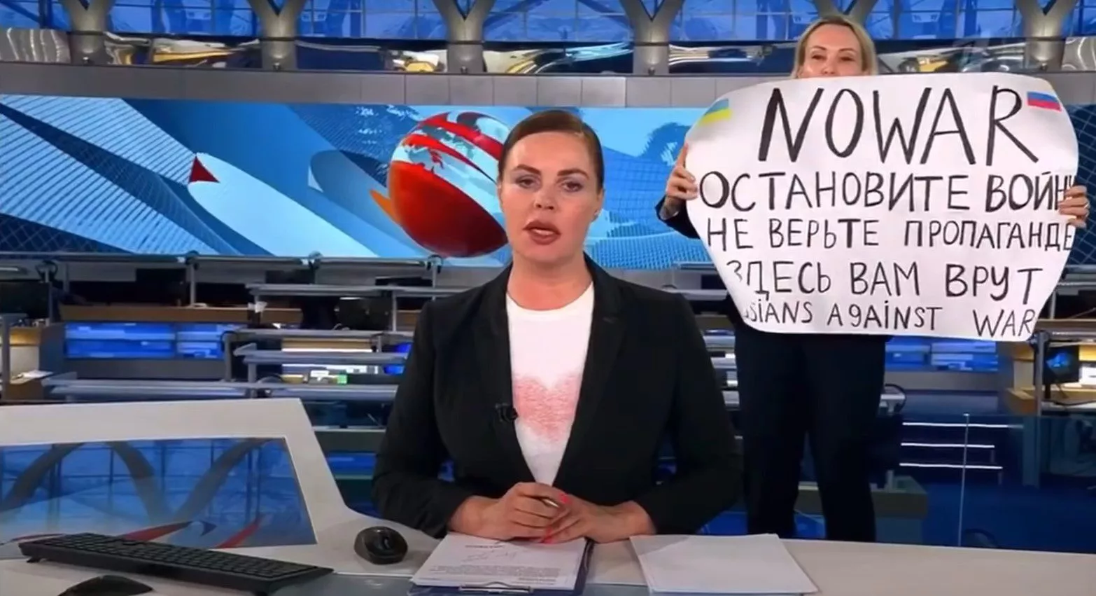 „Ne ratu. Ne verujte propagandi. Ovde vas lažu. Rusi su protiv rata“, stajalo je na natpisu s kojim je utrčala u program uživo. Moglo se čuti i kako ponavlja reči „ne ratu, zaustavite rat“.