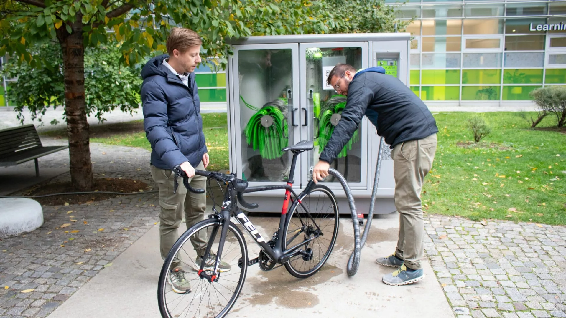 Inovativna perionica nalazi se na prostoru između zgrada univerziteta na trgu Hehštetplac (Höchstädtplatz) i može se besplatno isprobati. Ovim poduhvatom se u urbanoj sredini daje doprinos ekološkom i automatskom održavanju bicikala u Beču.