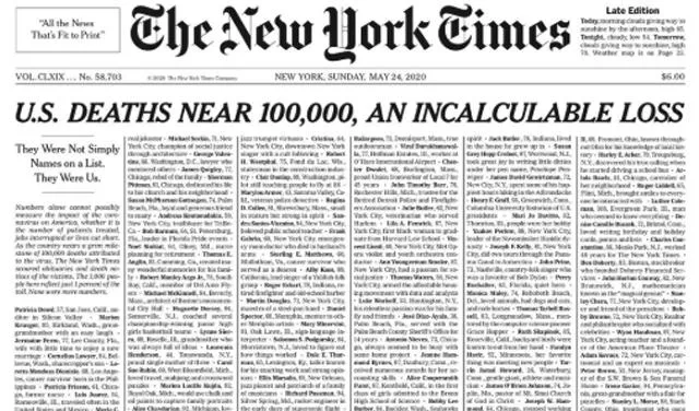 Pet meseci od kada je prvi slučaj koronavirusa registrovan u SAD, u toj zemlji je dostignuta brojka od skoro 100.000 preminulih. Na naslovnoj strani Njujork Tajmsa izlistano je samo jedan odsto tih slučajeva.