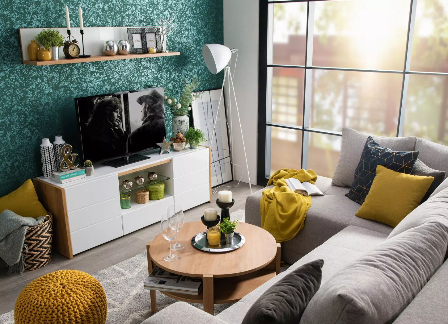 U ovakav ambijent odlično će se uklopiti ugaona garnitura TOLEDO u sivoj boji, a toplinu ć e istaći artisan hrast u detaljima na TV polici ALICIA i zidnoj polici MOLISE, kao i veoma praktičnom klub stolu TOBAGO. Kombinacija drvo dekora i zelene boje zaista stvara osećaj prirode unutar prostora.