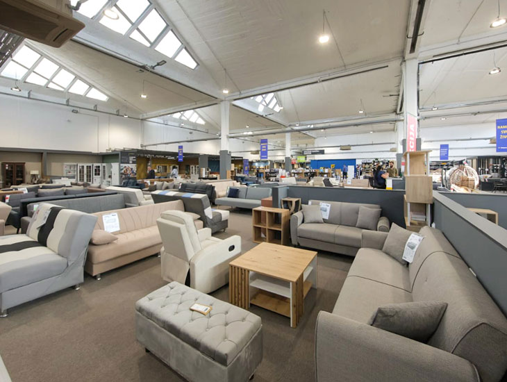 Na 3.000 m2 izložbeno-prodajnog i skladišnog prostora kupcima je predstavljen deo asortimana pločastog i tapaciranog nameštaja Forma Ideale, deo asortimana partnerskog programa, veliki izbor laminata, tepiha, rasvete, dekoracije, bele tehnike, kao i malih kućnih aparata.