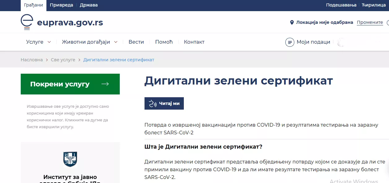 Da bi se dobio Digitalni zeleni sertifikat potrebno je da građani budu registrovani na Portalu eUprava.