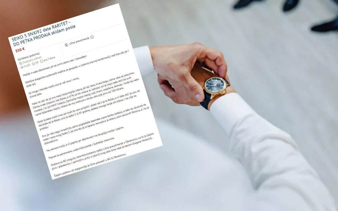 Oglas sa poznatog portala je za prodaju sata, Seiko 5 SNXJ92, a nije sam sat ono što najviše privlači pažnju, već oglas koji ga prati.