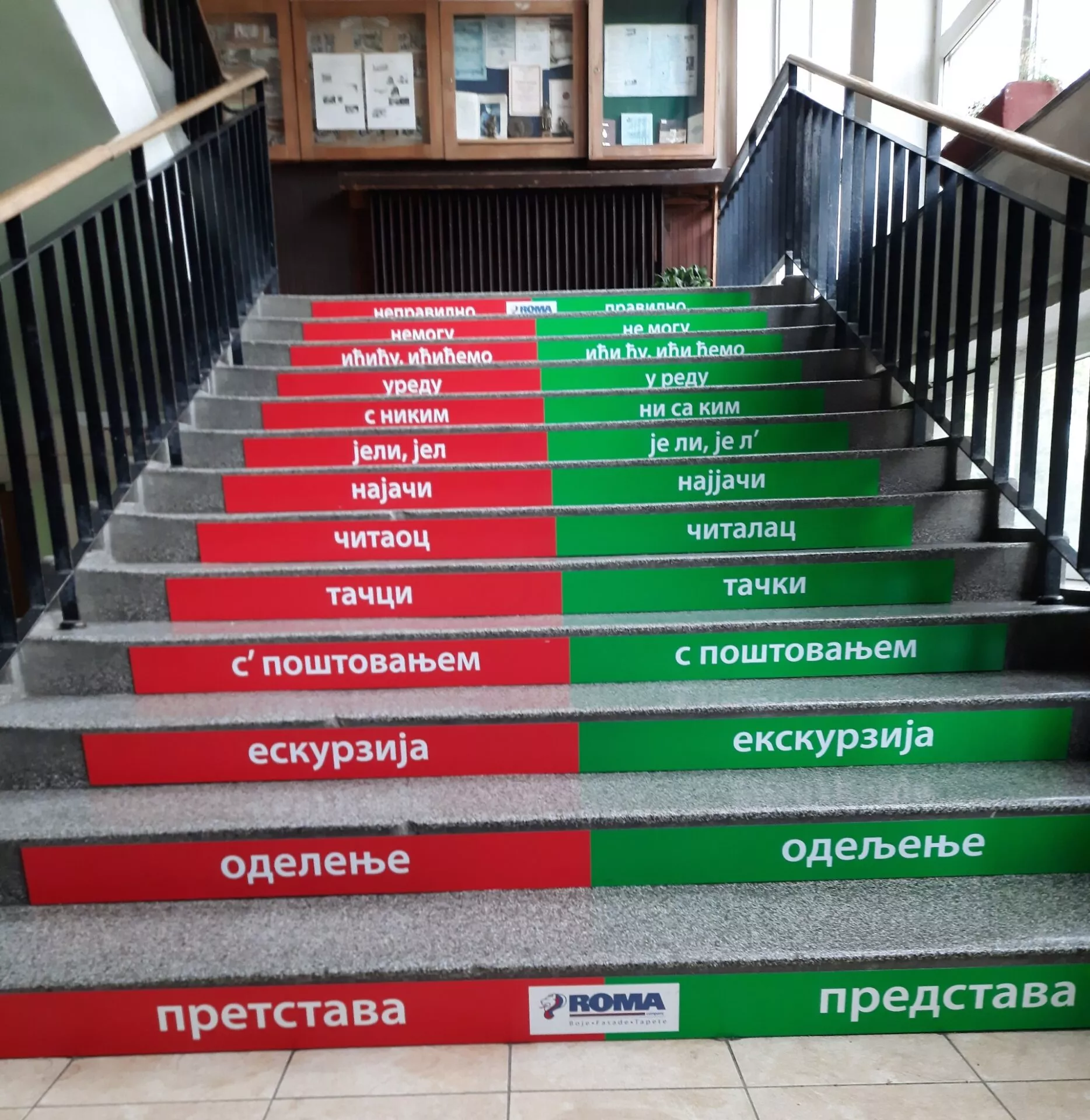 Unutrašnje stepenice, kojima đaci svakodnevno prolaze, pokazale su se kao idealno rešenje za postavljanje ispisa sa pravilnim i nepravilnim izrazima. Ne znam, da li, bio sam, najjači.. samo su neka od gramatičkih pravila koja će đacima svakodnevno biti na oku. Veliku podršku pružila je Roma Company, koja je obezbedila kompletan materijal za postavljanje ispisa na stepenicama.