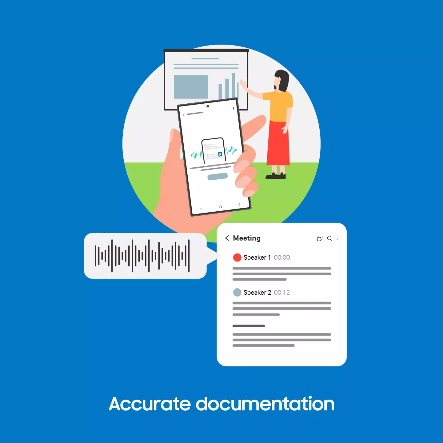 Funkcija Transcript Assistpravi sveobuhvatne, tačne beleške sastanaka i razgovora. Jednostavno snimite sastanak preko Samsung aplikacije za snimanje glasa, a nakon toga će vam Transcript Assist ponuditi da ga pretvori u tekst, sa razdvojenim rečenicama pojedinačnih govornika. Kada dobijete transkript, možete da ga podelite sa kolegama u tom obliku ili da ga pošaljete u Samsung Notes i dodate sažetak po tačkama koji generiše AI korišćenjem funkcije Note Assist.