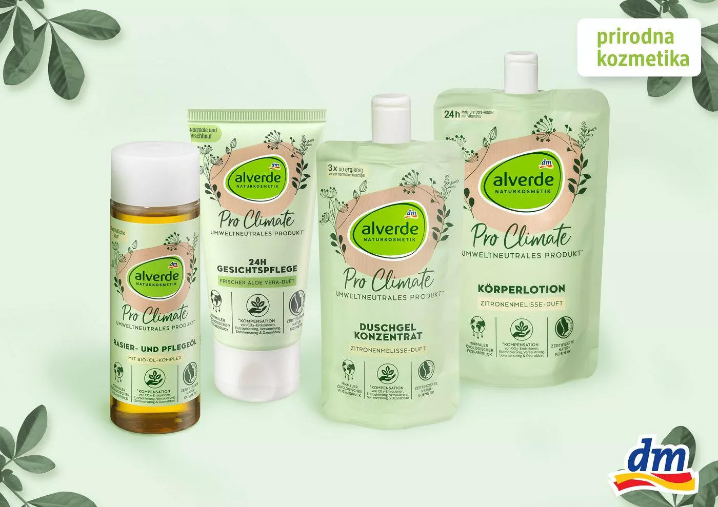 Na policama dm drogerija sukcesivno će se naći 14 Pro Climate proizvoda u okviru dobro poznatih dm robnih marki: alverde, Jessa, Sanft&Sicher, Denkmit i SUNDANCE. Među njima su proizvodi za svakodnevnu upotrebu – za sunčanje, negu lica i tela, kao i ličnu higijenu i domaćinstvo.