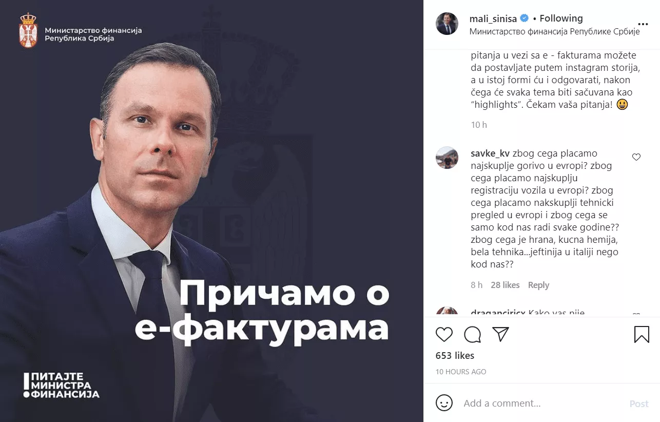 „Prošle nedelje smo vas zamolili da nam predlažete teme, i najveći broj vas je predložio da prva tema budu e-fakture. Vaša pitanja u vezi sa e-fakturama možete da postavljate putem Instagram storija, a u istoj formi ću i odgovarati, nakon čega će svaka tema biti sačuvana kao highlights. Čekam vaša pitanja!“, napisao je Siniša Mali.