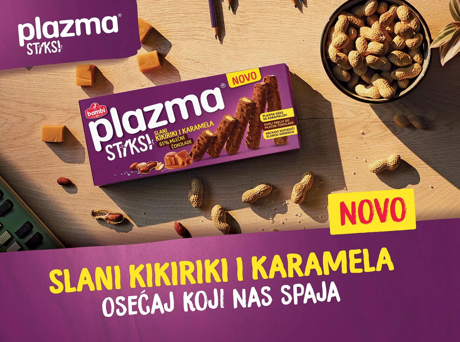 Kada želimo da predahnemo, nagradimo se posle napornog dana ili podelimo momenat čistog uživanja sa najmilijima, hrskava Plazma, hrabri slani kikiriki i zavodljiva karamela – idealan su izbor za to. Plazma Stiksi specijalno su kreirani za momente u kojima spoljašnji svet stane i ne postoji ništa više osim tog osećaja koji nas spaja i omiljenog zadovoljstva koje delimo. Prepoznatljivi ukus Plazme našeg detinjstva još jednom nas je iznenadio i ostavio bez daha, a Plazma Stiksi sa slanom karamelom i kikirikijem brzo će postati prepoznatljivi ukus detinjstva nekih novih klinaca.