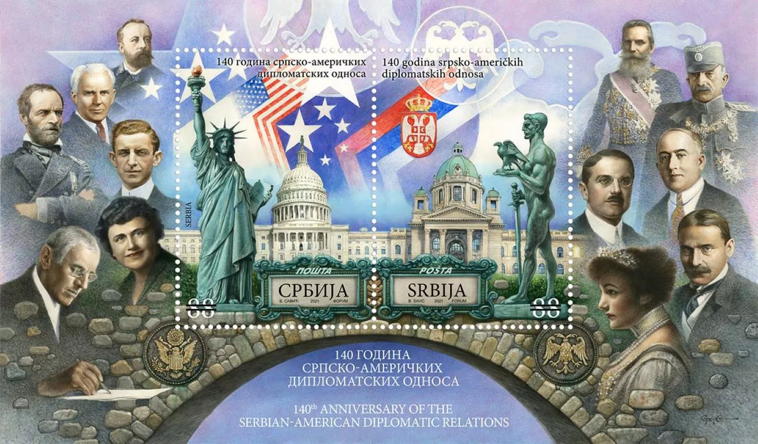 Povodom velikog jubileja – 140 godina zvaničnih diplomatskih odnosa Sjedinjenih Američkih Država (SAD) i Srbije, JP Pošta Srbije u saradnji sa ambasadom SAD u Beogradu, 15. oktobra ove godine emitovaće dve prigodne poštanske marke u formi bloka, saopšteno je danas iz Pošte Srbije.