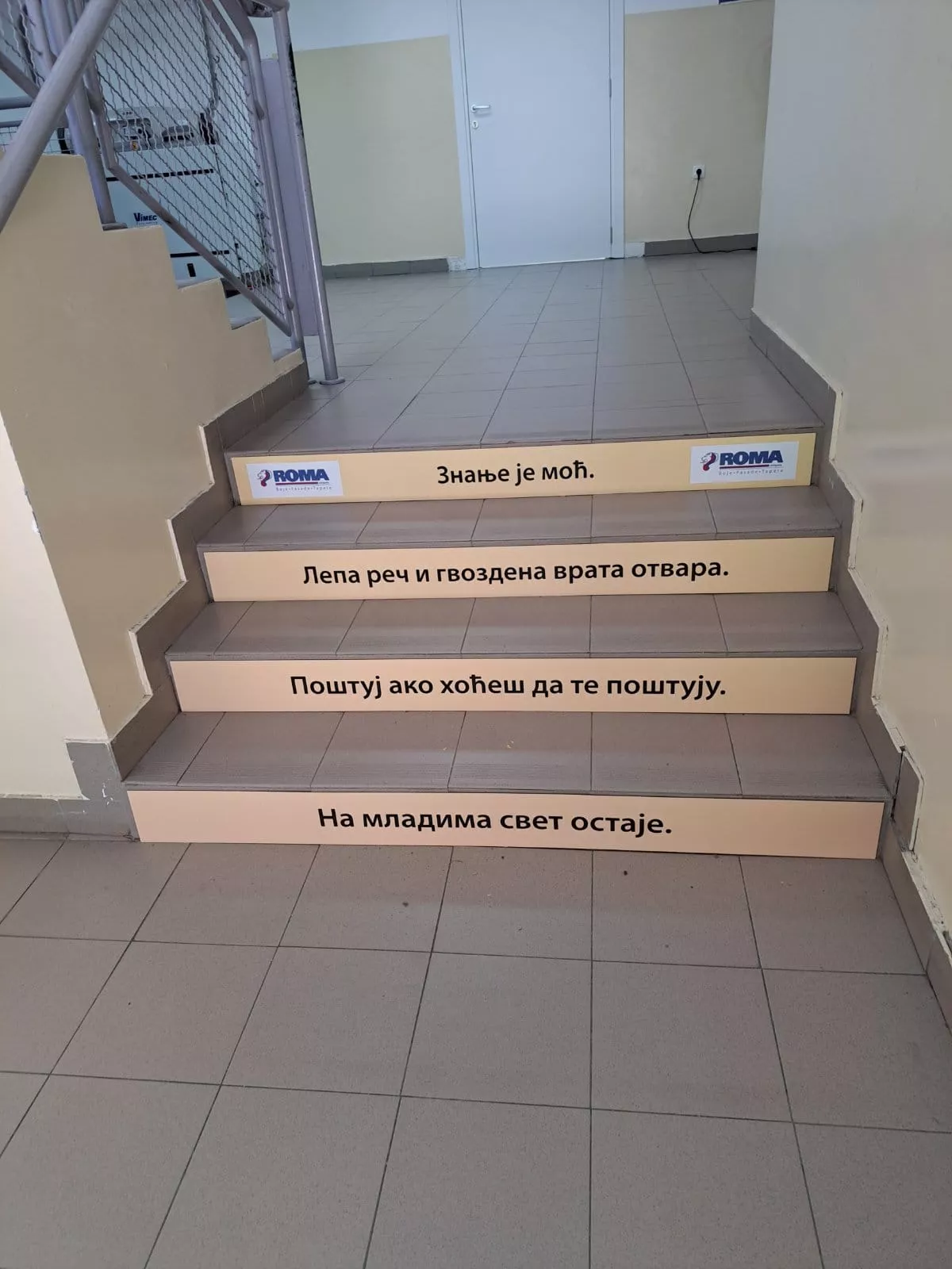 Unutrašnje stepenice, kojima đaci svakodnevno prolaze, pokazale su se kao idealno rešenje za postavljanje ispisa sa pravilnim i nepravilnim izrazima. Ne znam, da li, bio sam, najjači..samo su neka od gramatičkih pravila koja će đacima svakodnevno biti dostupna. Veliku podršku pružila je Roma Company, koja je obezbedila kompletnu donaciju za postavljanje pametnih stepenica.