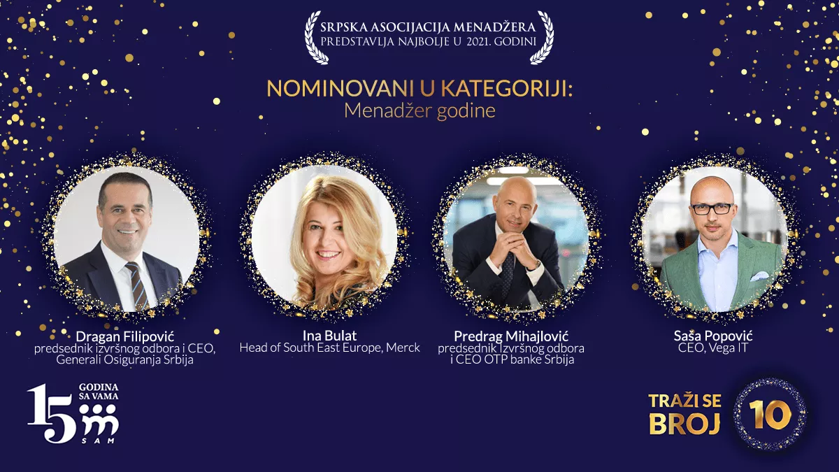 Kao osobe sa izuzetnim dostignućima koje su prepoznate unutar i van svoje kompanije u kategoriji „SAM Menadžer godine“ nominovani su: Dragan Filipović, predsednik izvršnog odbora i CEO Generali Osiguranja Srbija, Ina Bulat, Head of South East Europe, Merck, Predrag Mihajlović, predsednik Izvršnog odbora i CEO OTP banke Srbija, Saša Popović, CEO, Vega IT.