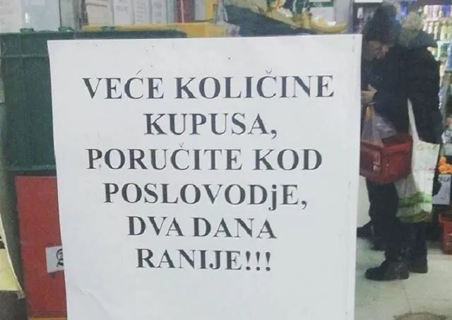 Tenziju, u ovo pretpraznično vreme, ne dižu samo aktuelna političko-društvena dešavanja i sve rašireniji protesti. Pritisak, izgleda, skače i zbog omiljene poslastice u ovo doba slava i nadolazećih praznika – kiselog kupusa. Dokaz je i obaveštenje koje je osvanulo na vratima jedne beogradske prodavnice. Alarmantna poruka: Veće količine kupusa, poručite kod poslovođe, dva dana ranije!!! Nadajmo se da nestašica kupusa neće biti povod za neke veće proteste u Beogradu, jer to bi već moglo da bude opasno.