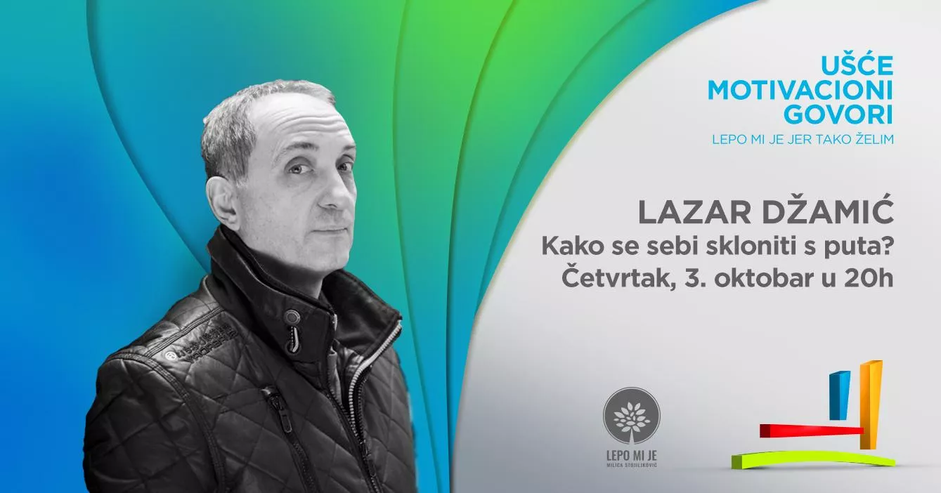 Zato nam je zadovoljstvo da vam najavimo jedno inspirativno predavanje Lazara Džamića, kreativnog stratega, profesora i pisca, koji će pred publikom u UŠĆU u četvrtak, 3. oktobra 2019. godine od 20 časova u sali 10 bioskopa Cineplexx, govoriti na temu kako da učestvujemo u procesu svog života, uvažavajući merila modernog društva i obilja informacija koje su svuda oko nas.