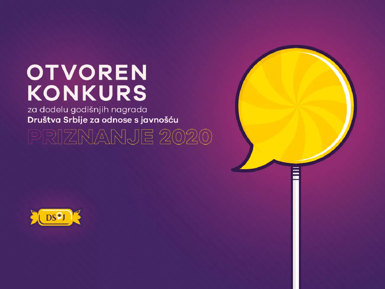 Sa velikim zadovoljstvom vas obaveštavamo da je konkurs Društva Srbije za odnose s javnošću za prijavu radova za ovogodišnju, 23. po redu, dodelu godišnjih nagrada – PRiZNANJE 2020. otvoren 28. jula i trajaće do 28. avgusta 2020. godine.