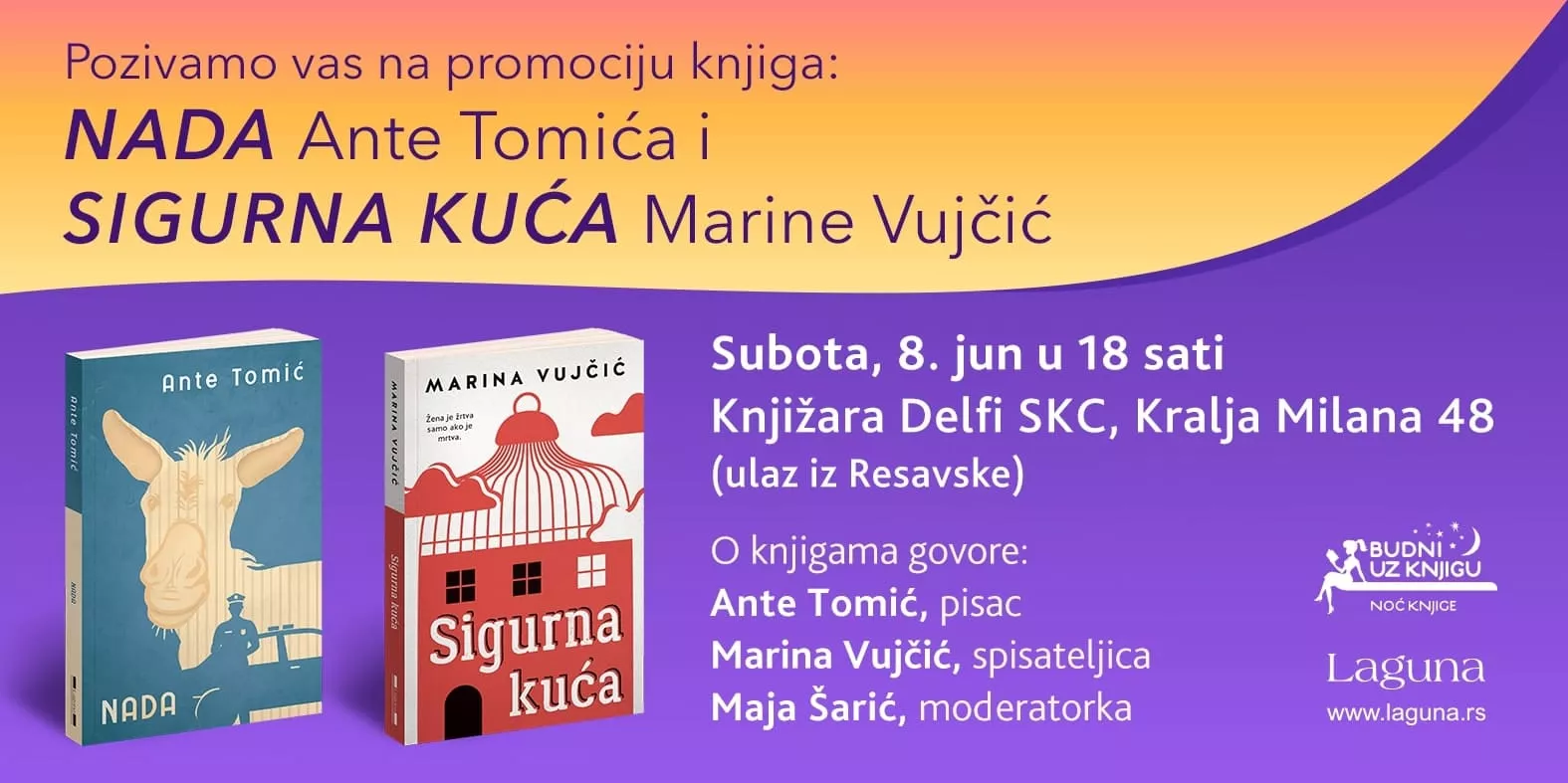 U subotu 8. juna od 18 sati u knjižari Delfi SKC biće održana promocija knjiga „Nada“ Ante Tomića i „Sigurna kuća“ Marine Vujčić.