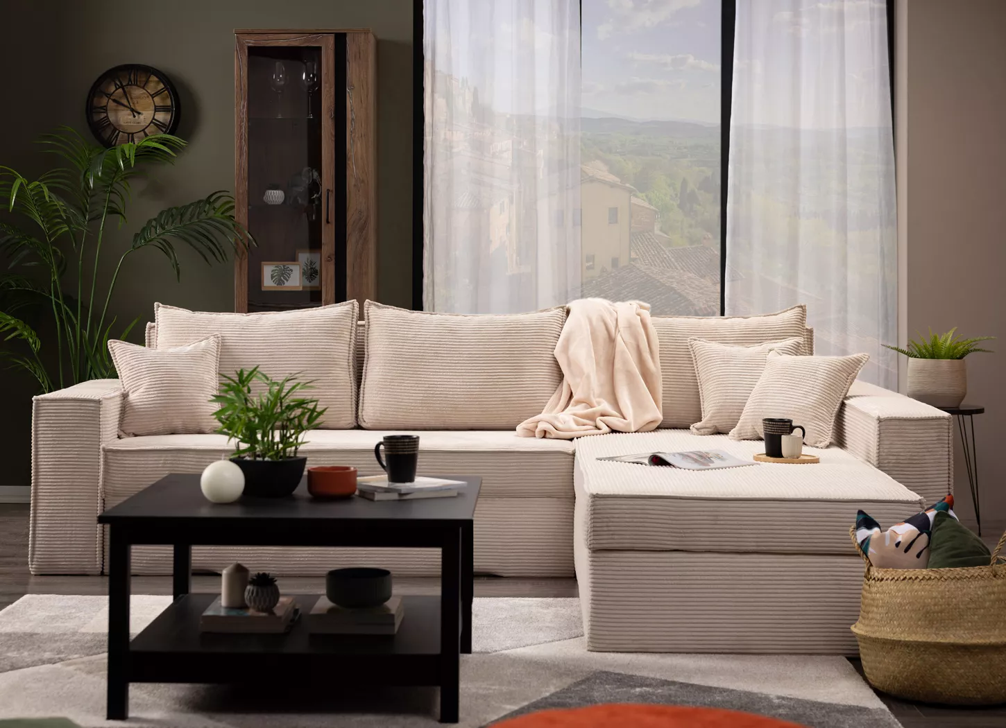 Odlično rešenje za prostrani dnevni boravak je ugaona garnitura OLYMP u nežnom, bež dekoru, koja pruža dosta mesta za sedenje, veliku površinu za spavanje, kao i kutiju za odlaganje posteljine. Uz nju bi se lepo uklopio i jedan ili pak više modela vitrine CORSICA , a za ovaj konkretan ambijent mi smo odabrali vitrinu CORSICA 1K VS1 u dekoru flagstaf hrasta obogaćenom crnim funkcionalno-dekorativnim detaljima. Visoki nogari na vitrinama su detalj koji daje autentičnost kolekciji CORSICA i čini je i modernim i praktičnim izborom za svaki savremeni životni prostor. Mogućnost dodavanja rasvete na vitrinama je jedna od njihovih prednosti, jer će u prostor uneti ambijentalnu toplinu.