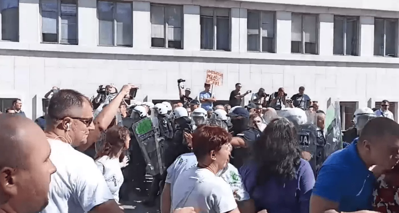 Okupljeni su uspeli da sruše i pomere ogradu, zbog čega su se sukobili sa obezbeđenjem.