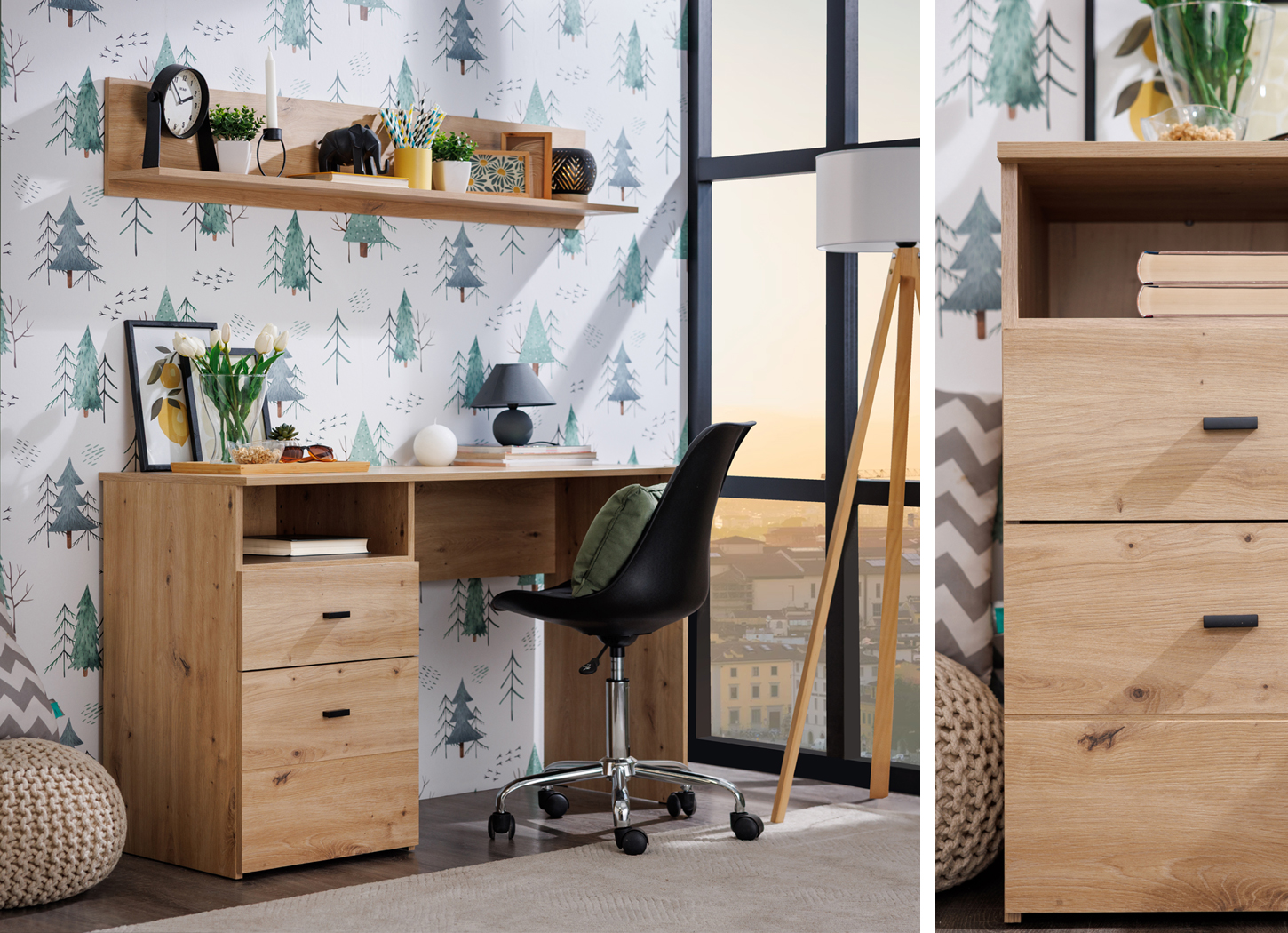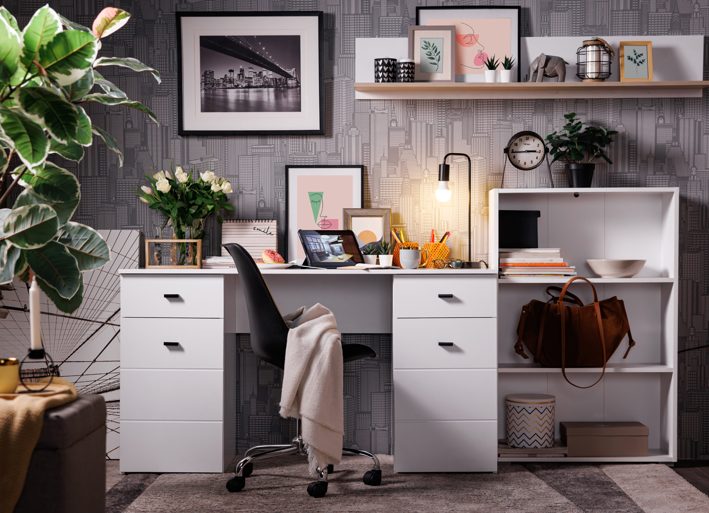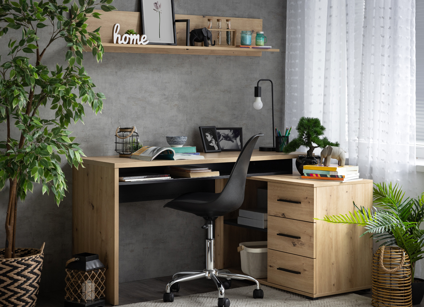 Da bi ambijent bio zaokružen, važno je pažljivo birati detalje: udobna kancelarijska stolica KJDC 70 pružiće potrebnu podršku tokom rada, dok će stona lampa ARIEL 1 i podna lampa AMAUNET uneti dodatnu dozu svetlosti i stila. Zidna polica LAVAL ZP savršena je za izlaganje knjiga, fotografija ili sitnica koje vas inspirišu, a dekorativna biljka i ram za slike ATMOSPHERA dodatno će omekšati prostor i dati mu lični pečat. Tako nastaje radni kutak koji nije samo funkcionalan, već i privlačan.