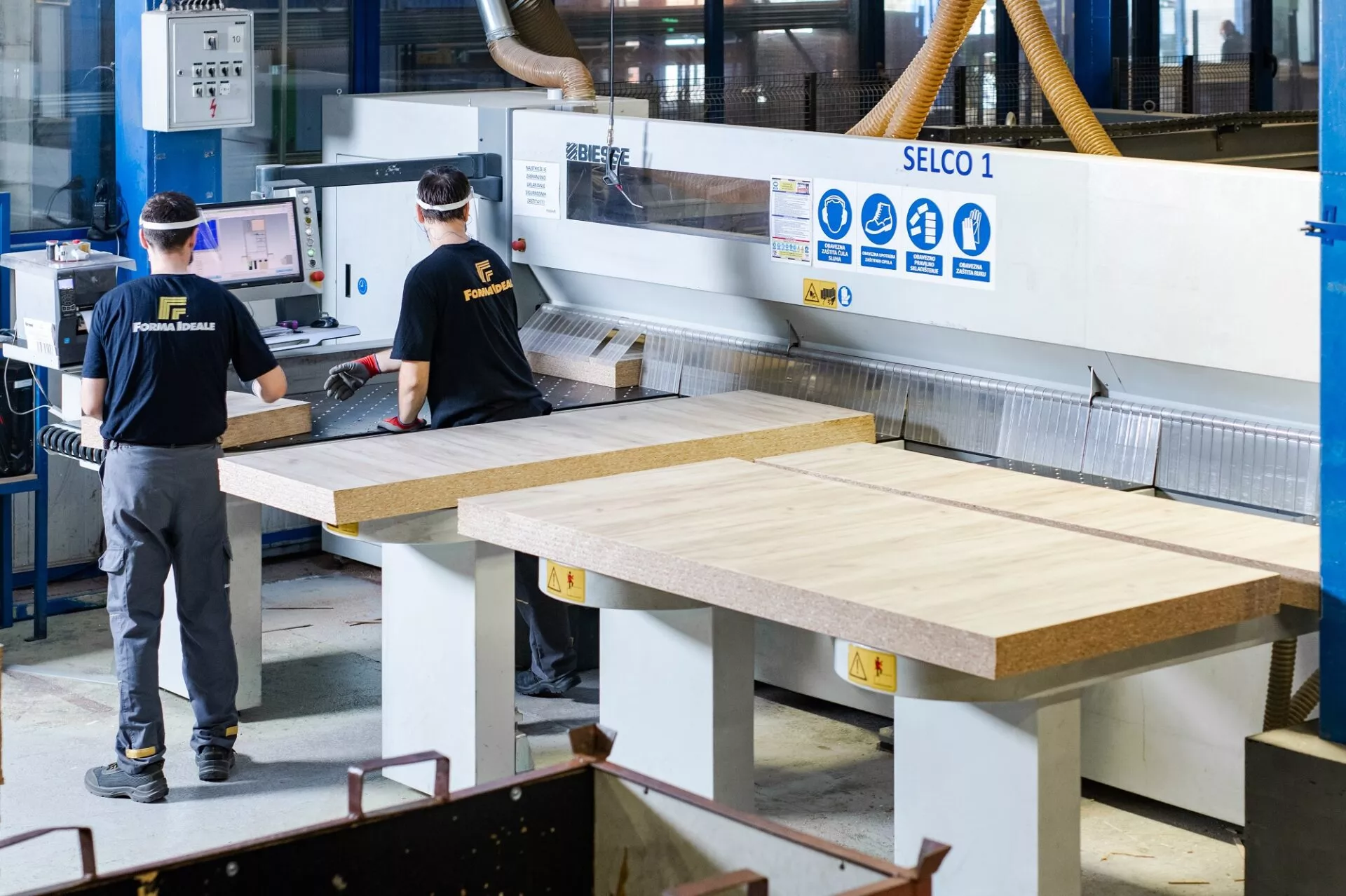 Pločasti nameštaj Forma Ideale proizvodi se u halama koje ukupno zauzimaju do 50.000 m2, a sve mašine u proizvodnim halama napravljene su od strane renomiranih svetskih proizvođača.