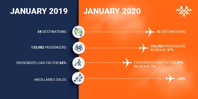 To ujedno predstavlja i najbolji rezultat za januar od pokretanja Er Srbije 2013. godine. Istovremeno, popunjenost kapaciteta za prevoz putnika (Load Factor) na letovima iz Beograda povećana je za 7 procentnih poena u odnosu na januar 2019. Pored toga, broj destinacija Er Srbije iz sprske prestonice porastao je sa 34 na 41, dok je prodaja sve popularnijih dodatnih usluga povećana za 44 odsto, u poređenju sa istim mesecom prosle godine.