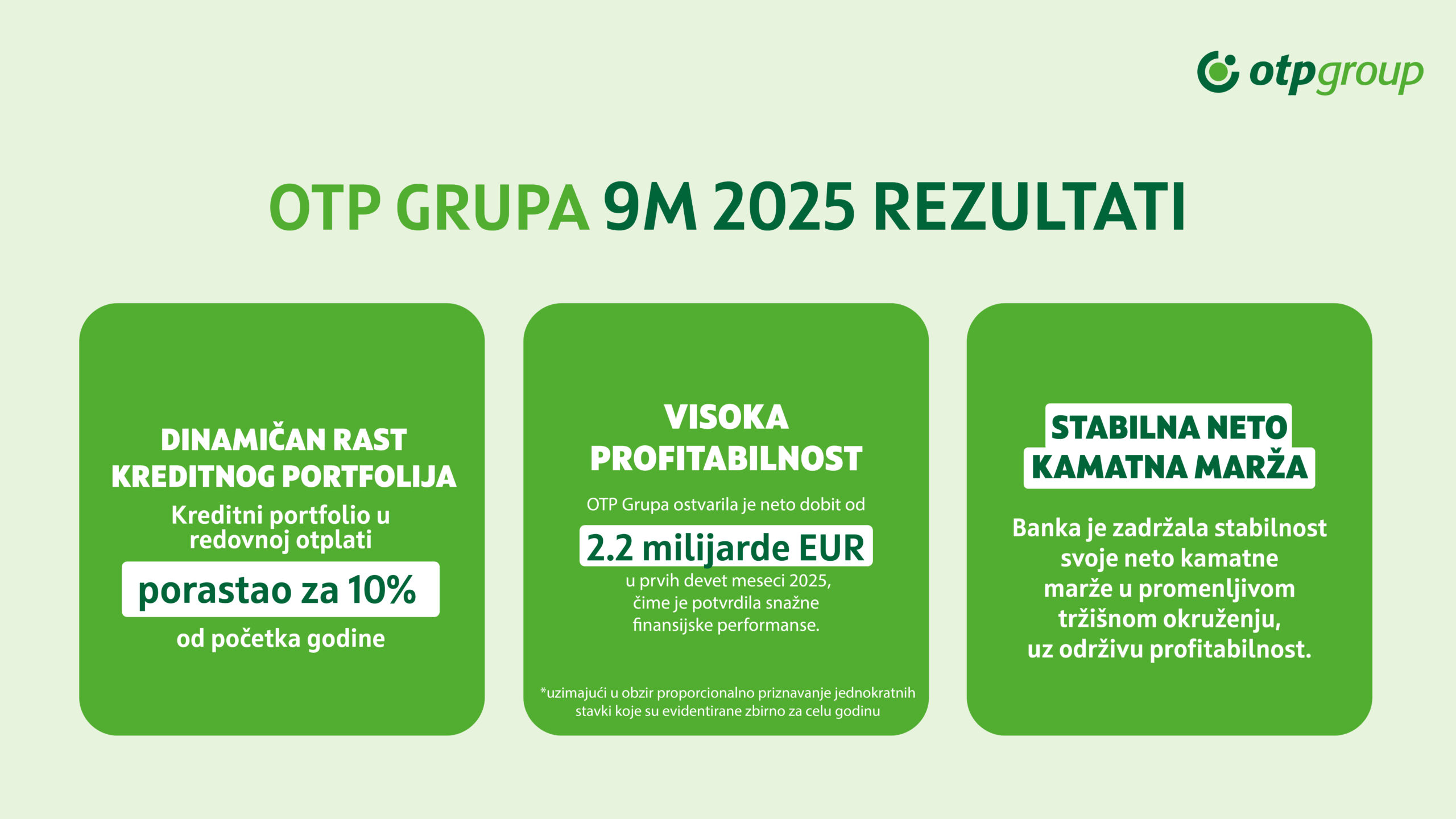 U prvih devet meseci 2025. godine OTP Grupa je ostvarila izvanredne rezultate i potvrdila snažne finansijske performanse. Od početka godine ostvarena je kumulirana dobit nakon oporezivanja u iznosu od 86 milijardi forinti, odnosno 2,2 milijarde evra i ROE od 22,7%, uz ravnomerno priznavanje posebnih rashoda (specijalni bankarski porezi u Mađarskoj, nadzorni izdaci u Bugarskoj, Mađarskoj i Sloveniji) proknjiženih na početku godine u ukupnom iznosu za celu godinu.