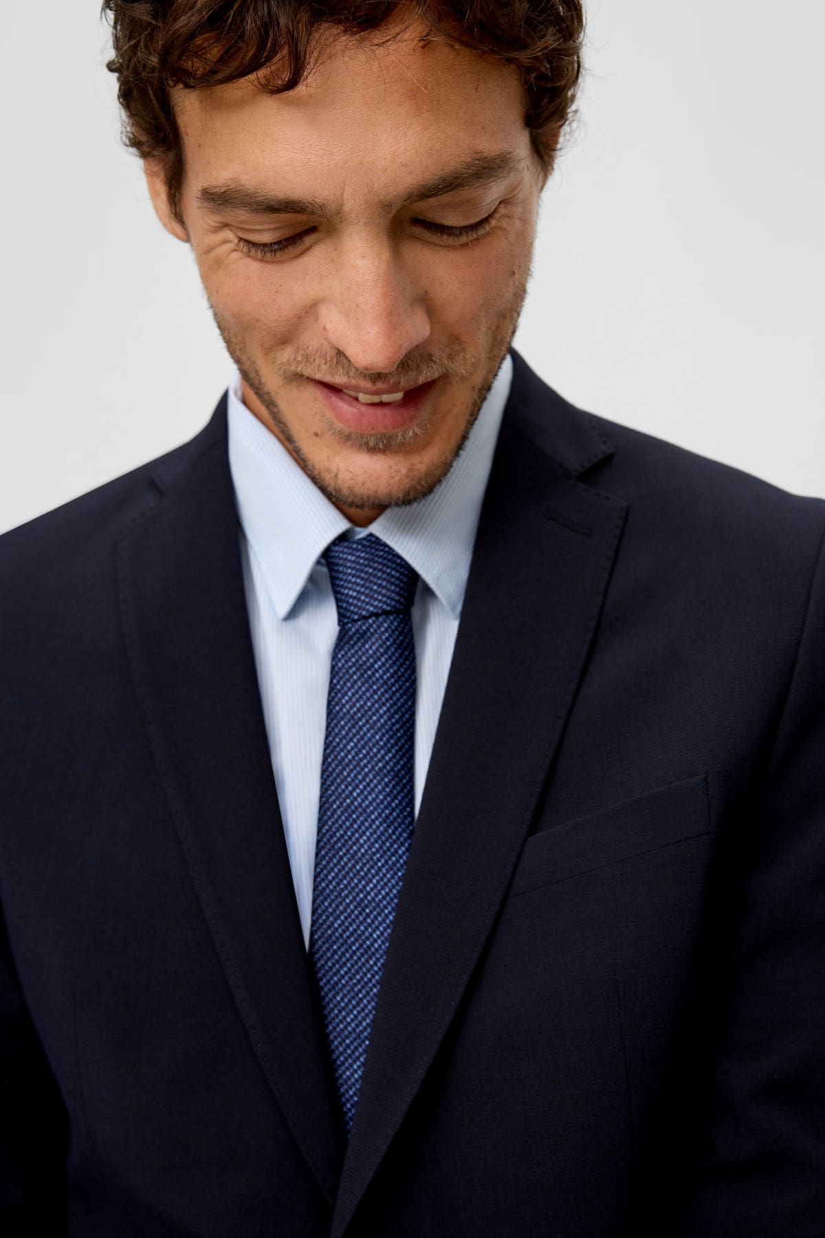 Tamnoplavi sako, tamnoplave pantalone, svetloplava košulja, kravata u nijansi plave, tamnobraon (konjak) kaiš i elegantne tamnobraon (konjak) cipele – jednostavno i veoma elegantno. Ne možete pogrešiti sa ovom kombinacijom.