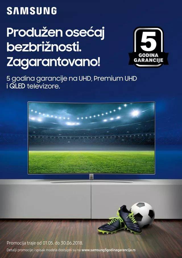 Pravo na produženu garanciju ostvaruju kupci odabranih Samsung UHD i QLED televizora periodu od 1. maja 2018. godine do 30. juna 2018, ukoliko se registruju preko internet stranice www.samsung5godinagarancija.rs.