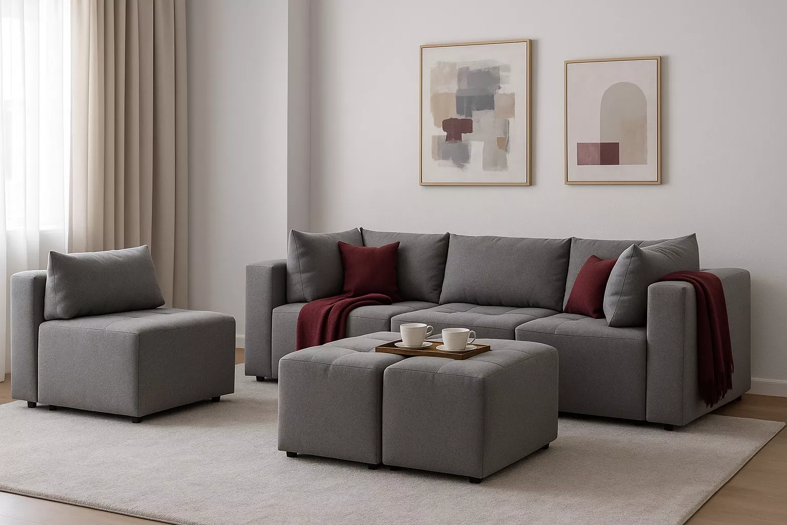 Najveća prednost ove garniture je njen modularni koncept, 7 kombinacija u 1 proizvodu, koji omogućava da sami kreirate izgled i raspored prema prostoru i trenutnim potrebama. Sa istim elementima Relja može biti – prostrana ugaona garnitura – savršena za porodična okupljanja,