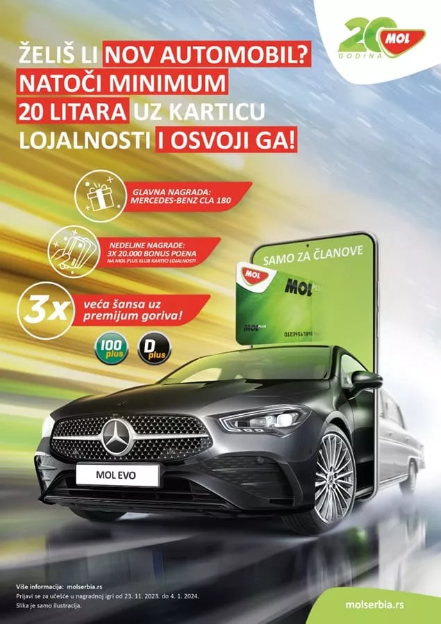 Mercedes-Benz CLA 180 ili 20.000 poena na MOL Plus klub kartici lojalnosti mogu biti vaši ukoliko natočite najmanje 20 litara bilo kog goriva na MOL Serbia servisnim stanicama i prijavite se za nagradnu igru koja je počela prošle nedelje.