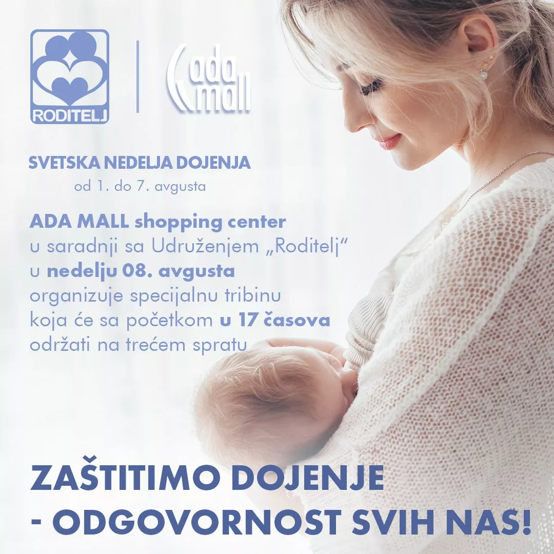 ADA MALL shopping center u saradnji sa Udrženjem „Roditelj“ u nedelju 08. avgusta organizuje specijalnu tribinu koja će se sa početkom u 17 časova održati na trećem spratu u Food court-u. U našoj zemlji ove godine se 16. put obeležava Svetska nedelju dojenja.