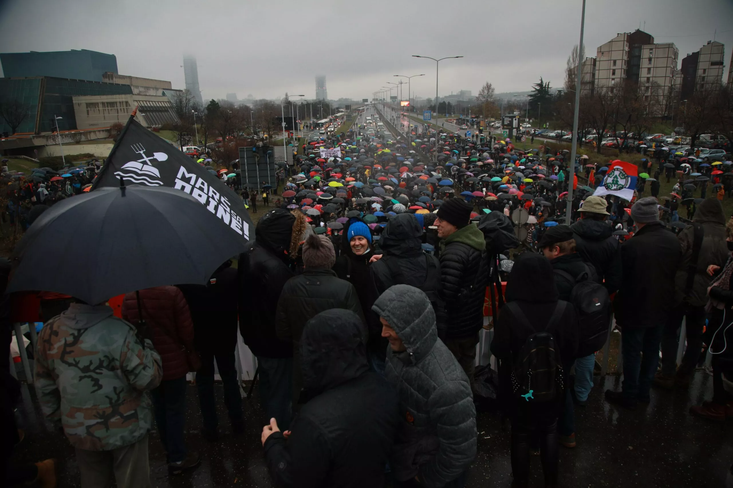 Nekoliko desetina građana je oko 14.30 zaustavilo saobraćaj i u Ulici Milentija Popovića, na nadvožnjaku.