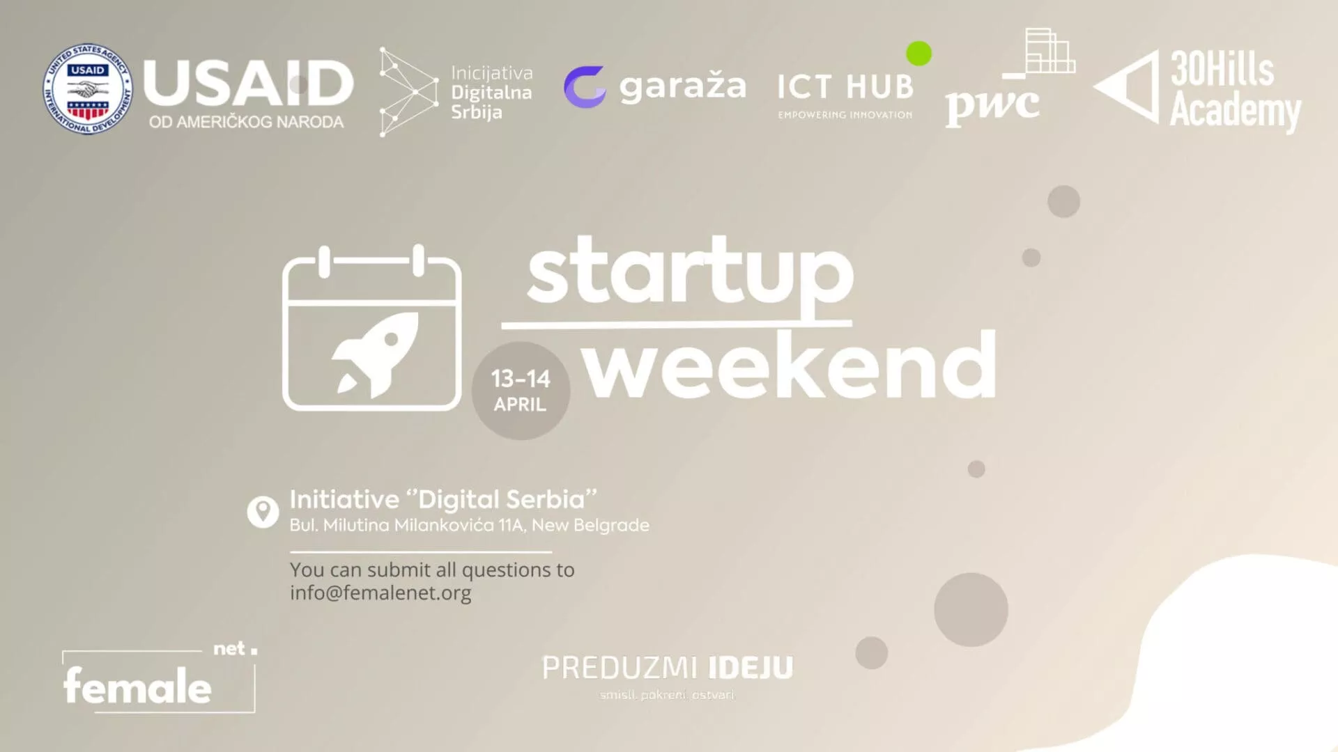 Zahvaljujući našim sjajnim partnerima, Startap Vikend će biti iskustvo koje ćete dugo pamtiti! Ovo izdanje Startap Vikenda u Beogradu organizuju Female Net u saradnji sa partnerskim organizacijama iz inovacionog ekosistema Srbije: USAID Srbija, Inicijativa Digitalna Srbija, Garaža by Tenderly, ICT Hub, PwC,30 Hills Academy i Preduzmi ideju.