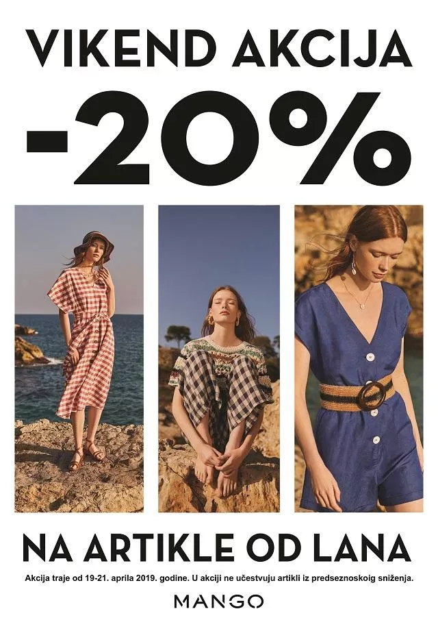 Očekujemo vas u našim MANGO radnjama u Beogradu – Ušće shopping center i Delta city, Novom Sadu – BIG shopping center, kao i Podgorici – Delta city. Akcija se ne odnosi na artikle obuhvaćene međusezonskim sniženjem.